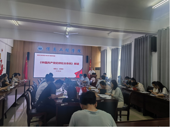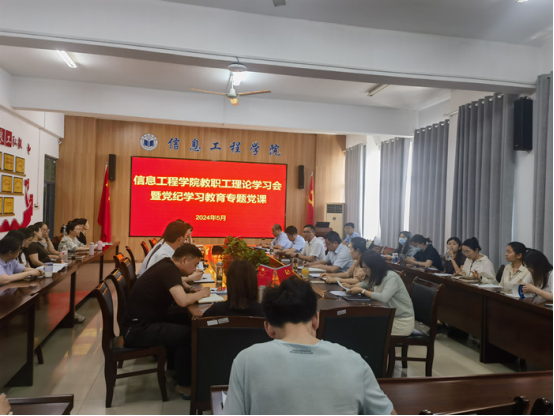 5月22日下午,信息工程学院于工B315召开教职工理论学习会,由信息工程学院党委书记余晓永讲授党纪学习教育专题党课,信息工程学院全体教职工参加。