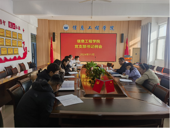 2024年11月27日,信息工程学院在工B315会议室召开支部书记会议。会议由信息工程学院党委书记余晓永主持,信息工程学院党委副书记、院长崔琳,信息工程学院党委副书记、纪委书记吴孝银,学院各支部书记参会。