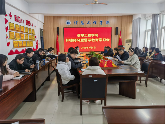 为进一步加强学院师德师风建设,提升教师职业道德素养。2025年3月5日,信息工程学院在工B315召开了师德师风暨警示教育学习会,会议由信息工程学院党委副书记、纪委书记吴孝银主持,学院全体教师参与会议。