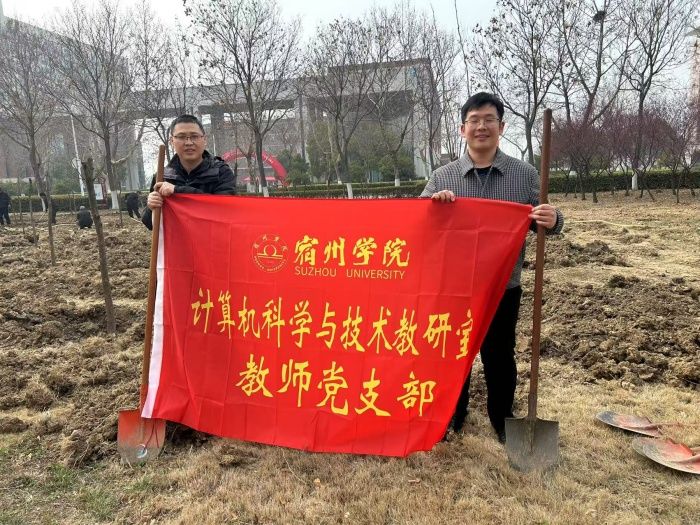 2025年3月26日下午,计算机科学与技术教研室教师党支部开展“党旗映绿荫,教师共植春”主题党日活动。党支部书记徐旭带领党员教师挥锹铲土,在规划林种植树苗,以实际行动践行生态文明理念。