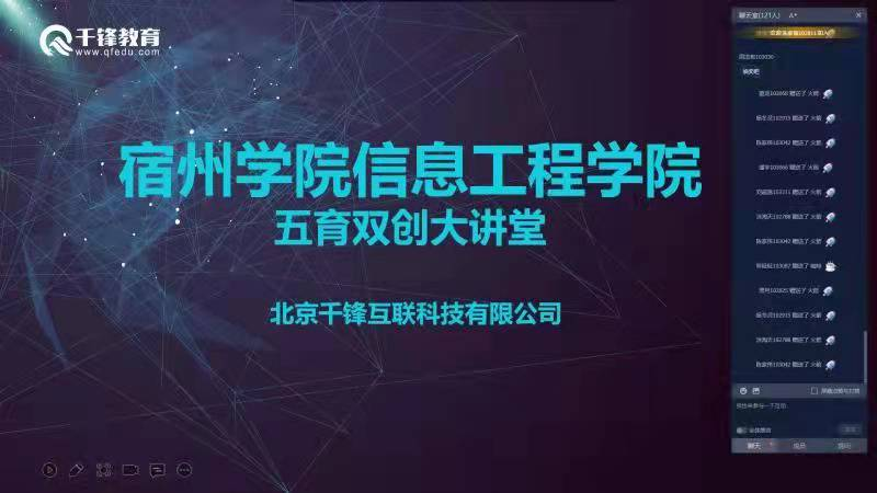 “五育”双创大讲堂(“时情大讲堂”、“创新大讲堂”、“体创大讲堂”、“美创大讲堂”、“创业大讲堂”)是深化创新创业教育教学改革的重要抓手,信息工程学院邀请校企合作单位“万和”“数字奇安”“千锋”举办“线上”“五育双创”大讲堂。20级计算机类专业和21级计算机类专业学生共计389人参加了江苏万和”“合肥数字奇安”“北京千锋”的讲座活动。