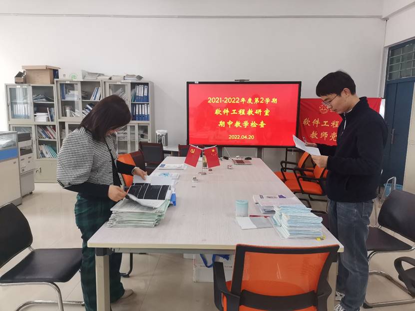 4月20日中午,根据学校、学院教学工作安排,软件工程教研室开展2021-2022学年度第二学期期中本科教学检查工作,信息工程学院科研副院长崔琳教授、软件工程教研室主任张志伟等老师组成检查组,对软件工程教研室各位老师的教学材料进行检查。
