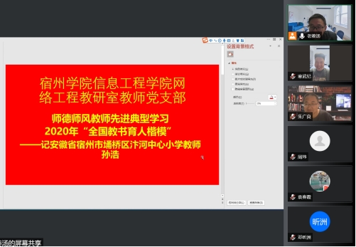 为认真宣传师德师风教师先进典型,学习2020年全国教书育人楷模“麦田里的守望者”——埇桥区汴河中心小学教师孙浩精神,网络工程教研室于4月21日晚上召开线上德师风教师先进典型宣传学习会,会议由教研室主任姜飞教授主持。