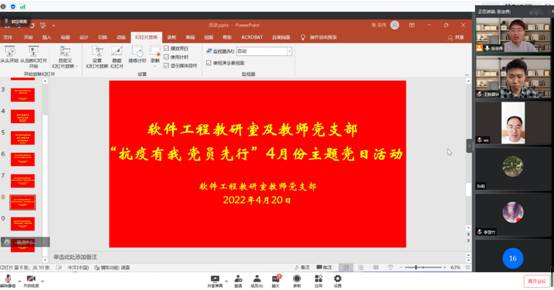 2022年4月27日中午1点半,软件工程教研室及教师党支部联合开展“抗疫有我 党员先行”四月份主题党日活动,活动以线上腾讯会议形式召开,会议由党支部书记张志伟主持,软件工程教研室及党支部全体教师参加。