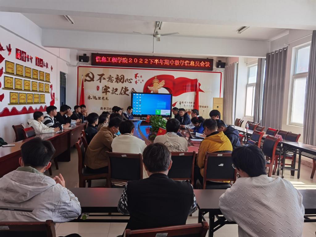 为加强教育教学质量管理,完善教育教学信息反馈沟通机制,充分发挥学生教学信息员在教学质量保障体系中的作用,保障教育教学信息反馈工作顺利开展。10月10日上午,信息工程学院在工B315召开2022-2023(1)学期教学信息员会议。信息工程学院院党委副书记、院长许海峰,党委副书记、纪委书记吴孝银,教学副院长潘正高,各教研室主任和各班级教学信息员参加了会议。