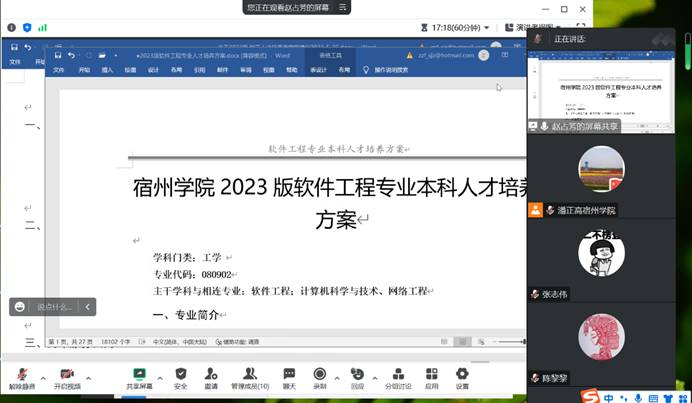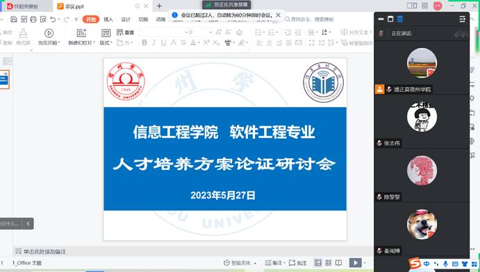 为进一步加强软件工程一流专业建设,有序推进软件工程专业工程教育认证工作,5月27日晚上20:00,信息工程学院线上召开软件工程专业人才培养方案论证研讨会。本次论证会邀请了河北地质大学赵占芳教授指导点评,会议由信息工程学院教学副院长潘正高主持,学院工程教育认证小组全体成员参加了此次会议。