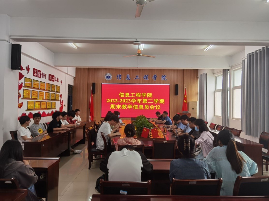 为进一步完善教学质量监控体系,畅通教学信息反馈渠道,了解学生的学习和教师的教学情况,同时在本学期结束前做好期末阶段教学监管工作,信息工程学院于6月7日1点30点在工B315召开期末教学信息员会议,学院教学副院长潘正高、副书记吴孝银、教学秘书徐旭和各教研室主任参加了此次会议。