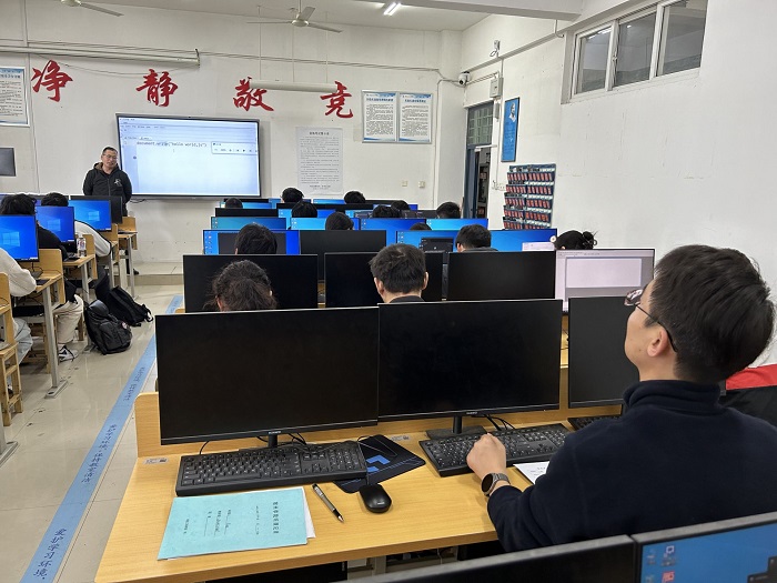 王胜老师先是理论讲解“第十五章JavaScript基础” 中的相关知识,然后通过实验演示具体的代码编写和实现方法,最后让学生们自己编码练习。整个教学过程中,王老师重难点明确,教学思路清晰,教学内容丰富具体,课堂教学秩序好。