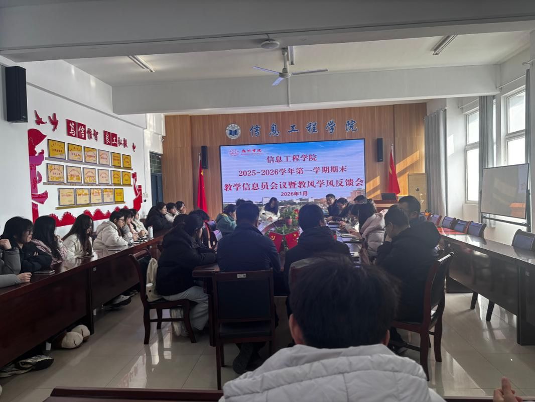 1月7日下午,信息工程学院召开2025-2026学年第一学期期末教学信息员会议暨教风学风反馈会,学院领导、院教学督导组、教学秘书、实习实训中心主任、教研室主任、专业负责人以及各班级教学信息员参会,会议由教学副院长潘正高主持。