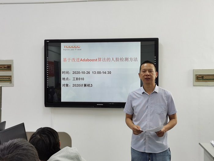 2020年10月26日下午,在工B510室,信息工程学院张万礼为我院2020计算机3班全体学生做关于Adaboost算法的人脸检测方法的报告。