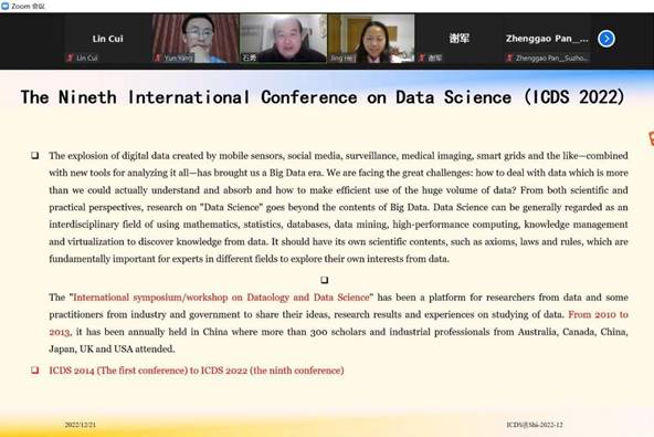 2022年12月21日,由牛津大学、中国科学院大数据挖掘与知识管理重点实验室、南京邮电大学、宿州学院、南京财经大学等联合举办的第九届数据科学国际会议(ICDS 2022)(The 9th International Conference on Data Science, ICDS 2022)以线上和线下相结合的方式成功召开。国务院参事、中国科学院大数据挖掘与知识管理重点实验室主任石勇教授担任此次大会的总主席。