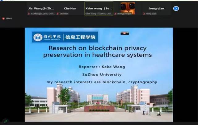 针对医疗大数据信息在人们的日常生活中发挥着越来越重要作用,为了防止医疗数据泄漏,王柯柯团队提出了一种新型的基于区块链的去中心化零知识证明机制,以保护医疗系统中的隐私。张开杰同学在王超博士等老师的用心指导下,通过引入坐标注意机制对维度的空间特征信息进行平均,并改变逆残差模块的残差边缘的输入和输出,设计了一种性能优异的矿山车辆车头和车尾智能识别监控系统。王柯柯老师和张开杰同学分别用全英文流畅汇报了研究内容。