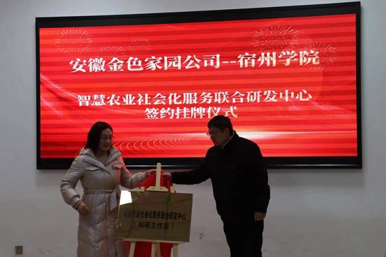 2月2日,安徽金色家园农业社会化服务有限公司与宿州学院共建智慧农业社会化服务研发中心揭牌仪式在安徽金色家园农业社会化服务有限公司会议室举行。宿州市妇女联合会党组成员、副主席陈芳芳、宿州学院信息工程学院党委书记余晓永、院长许海峰、安徽金色家园农业社会化服务有限公司董事长戚仁杰共同为智慧农业社会化服务研发中心揭牌。宿州市妇女联合会发展部部长岳永、宿州学院信息工程学院科研副院长崔琳、科研秘书邱慧丽、学生事务科科长吴雨桐、安徽金色家园农业社会化服务有限公司总经理孙韩、运营总监张遵贤等共同出席了揭牌仪式。