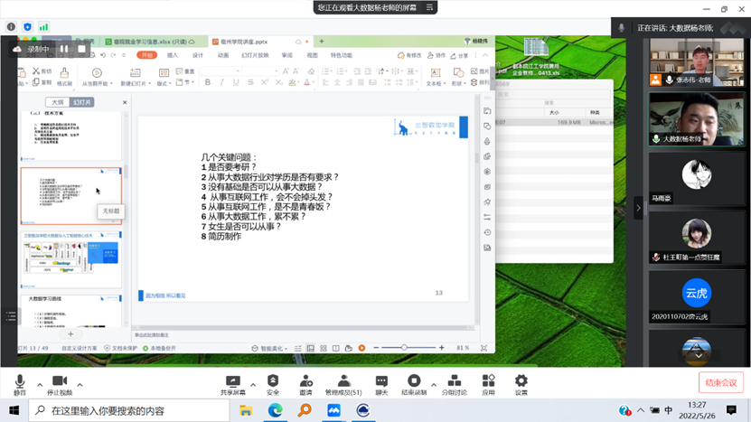 为加快推进科技规划政策扎实落地,广泛宣传科技创新成果,开展科学普及惠民活动,根据科技部、中央宣传部、中国科协《关于举办2022年全国科技活动周的通知》(国科发才〔2022〕69号)、安徽省科学技术厅、中共安徽省委宣传部、安徽省科学技术协会《关于举办2022年安徽省科技活动周的通知》(皖科智秘〔2022〕144号),以及《关于举办2022年宿州学院科技活动周的通知》精神。5月26日中午,信息工程学院线上举行了“信息工程学院科技活动周之‘大数据时代下的行业前景及就业’科技报告暨‘兰智杯’第4届宿州学院大数据大赛宣讲”活动,此次科技活动邀请了安徽兰智数加学院院长杨晓伟进行了专场报告,信息工程学院软件工程专业、网络工程专业、计算机科学与技术专业、以及数据科学与大数据技术专业相关师生在线聆听了专场报告。