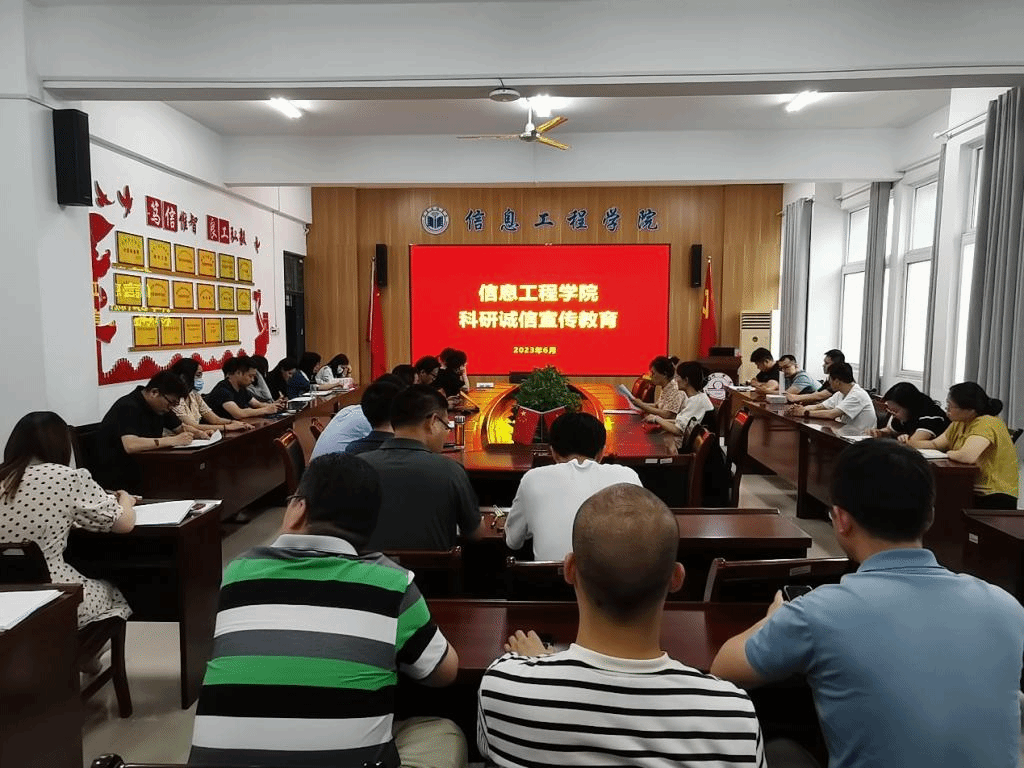 为深入贯彻党的二十大精神,落实中共中央、国务院和教育部关于加强诚信建设的文件要求,2023年6月29日下午,信息工程学院面向全体教师开展了科研诚信宣传教育活动。
