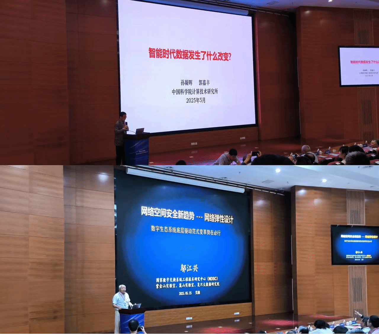 在论坛正式学术交流环节,专家们带来了精彩的报告。孙凝晖院士在《智能时代数据发生了什么改变?》的主旨报告中,深入阐述了AI发展如何推动数据从量变走向质变,以及这一变革对计算架构与认知模式的深远影响;邬江兴院士围绕国家网络安全战略进行了深刻解读,提出了“安全左移”的创新理念,强调在AI系统设计的全流程中,必须内嵌网络安全责任,以确保智能系统的稳健与安全。
