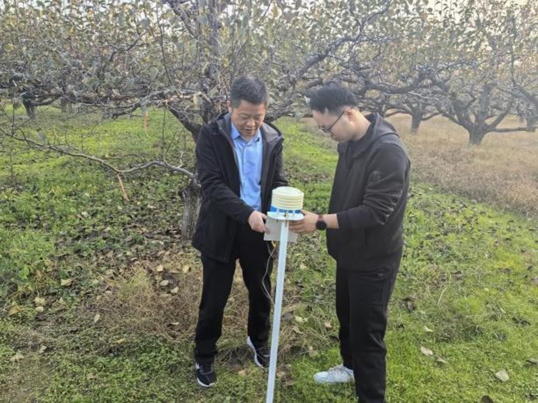 2025年11月4日至5日,信息工程学院潘正高教授率课题组沈书豪和张威两位博士,联合安徽省气象局、西北农林科技大学机械与电子工程学院及砀山县气象局等单位,赴砀山县壹号梨园完成“酥梨生长—气象—灾害研究”野外采样站布设。