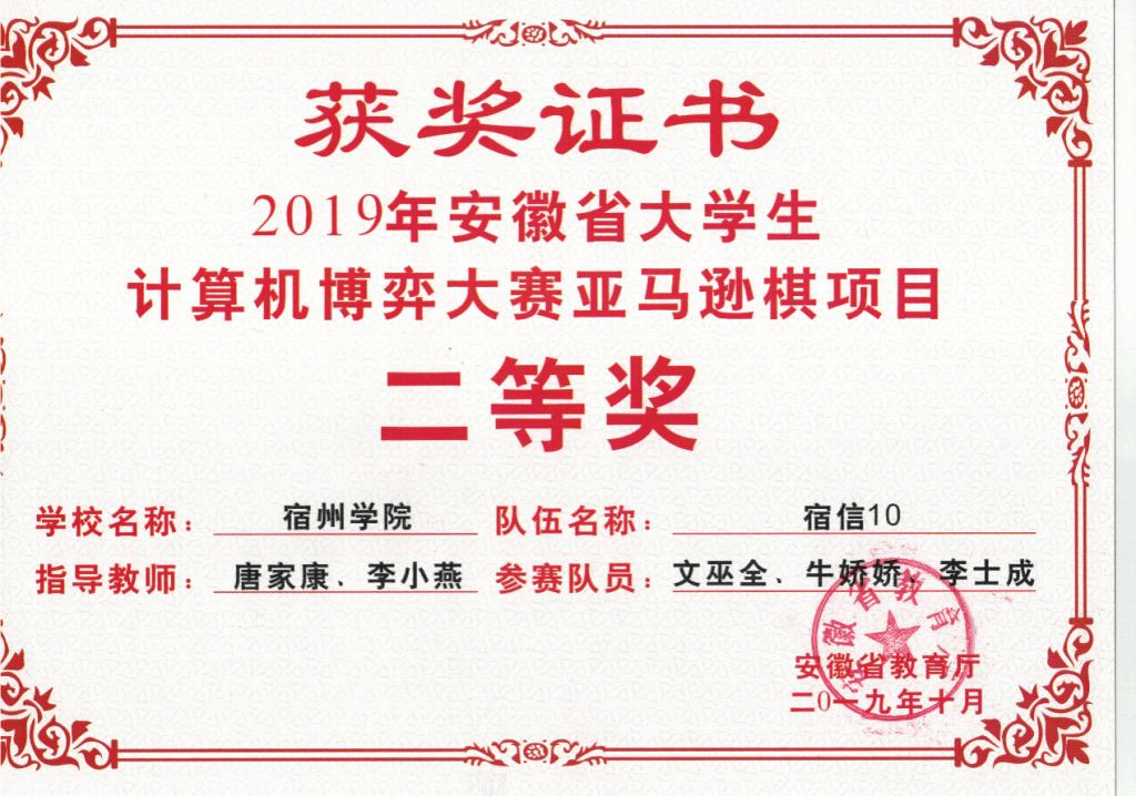 安徽省计算机博弈大赛是由省教育厅主办、省高等学校计算机教育研究会承办的一项重要赛事。大赛旨在调动大学生学习与研究热情,有效提高大学生计算机水平,激发大学生创新潜能,培养大学生科学素养和专业技术实践技能,为优秀的人工智能人才脱颖而出创造条件。 通过组织参加本次竞赛,不仅激发了学院学子学习人工智能的积极性,而且促进了教师们在人工智能课程教学方面的改革与创新。我校从2019年参加此项比赛,共获得13个奖项 一等奖 2项 二等奖5项,三等奖6项。