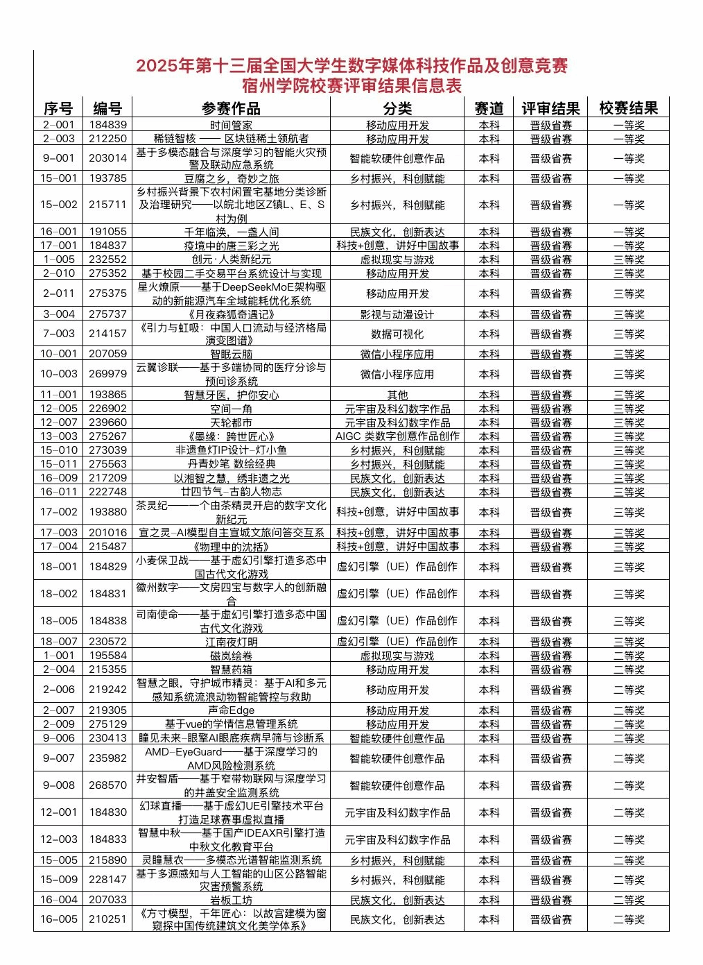 关于第十三届全国大学生数字媒体科技作品及创意竞赛宿州学院校赛结果及拟推荐进入省赛的公示