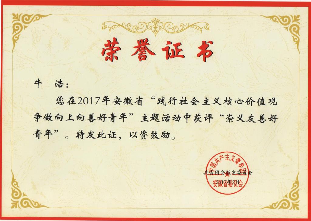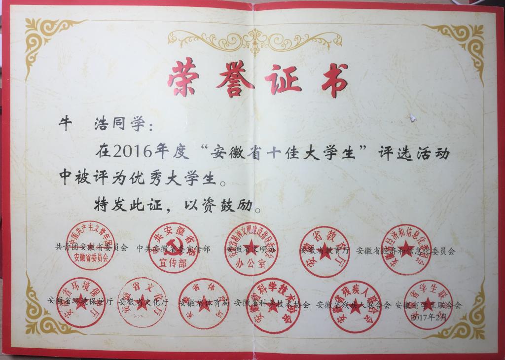 在校期间立足学习思考、创新创业、热心公益、服务社会等方面全面发展,先后获得安徽省优秀大学生、安徽省向上向善好青年、安徽省“创青春”大学生创业大赛优秀奖、安徽省青年马克思主义者培养工程大学生骨干培训班“优秀学员”、校“优秀团干部”、“十佳大学生”、“大学生自强之星”等50多项荣誉表彰,被认定为宿州学院2017年“践行社会主义核心价值观先进个人”。