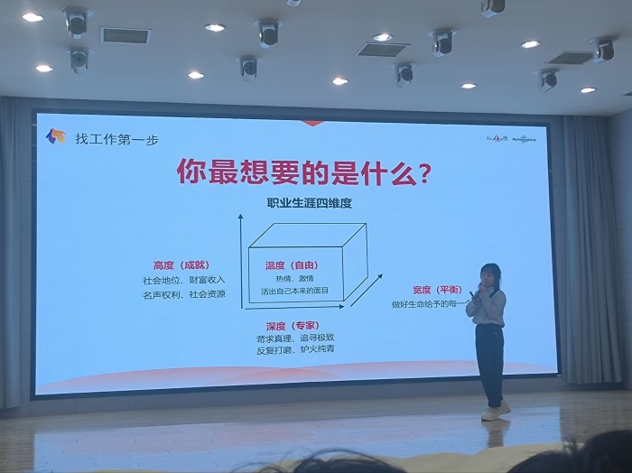 首先,主讲人就当今就业形势向同学们进行了的讲解,针对目前大学生就业形势也做出了具体的分析。并且向同学们介绍了几个就业时的工作准备:除了应当具备专业知识和能力以外,还应当具有良好的心理素质和一定的求职技巧。其中,主讲人黄威提到,找工作的第一步要清楚你最想要的是什么,主要从高度(成就)、温度(自由)、深度(专家)、宽度(平衡)职业生涯四维度展开分析,使同学们对于求职更加了解。紧接着,主讲人黄威开从公司简介、2024人才引进计划、培养体系以及公司福利等更多个方面展开介绍。