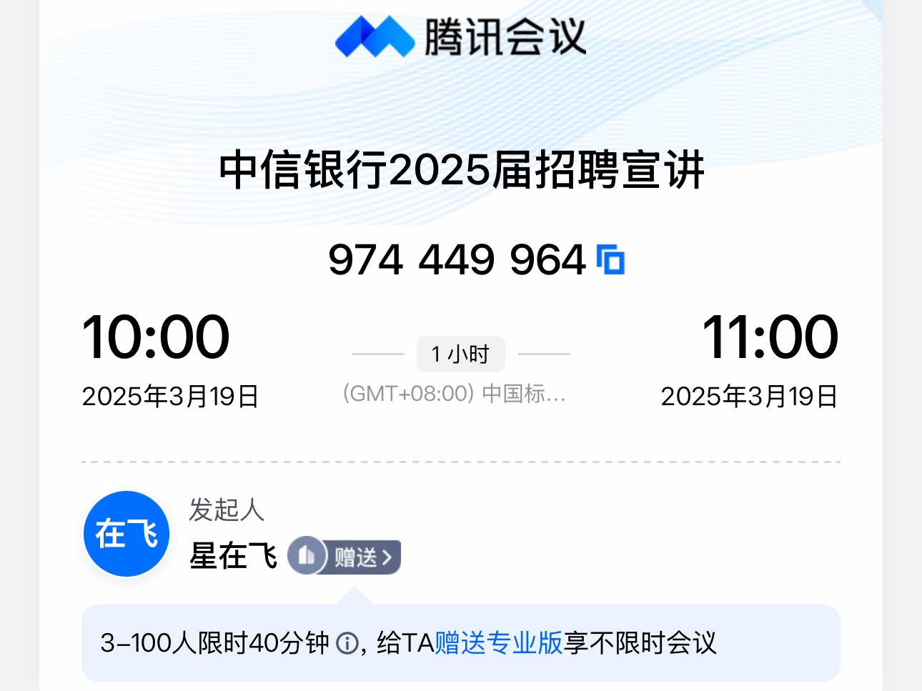 为精准对接我院学子职业发展需求,中信银行主办的2025年校园线上招聘宣讲于2025年3月19日10:00-11:00在腾讯会议召开。本次活动聚焦金融科技、业务管理、客户服务等多领域校招岗位,为应届毕业生打造“零距离”求职通道。