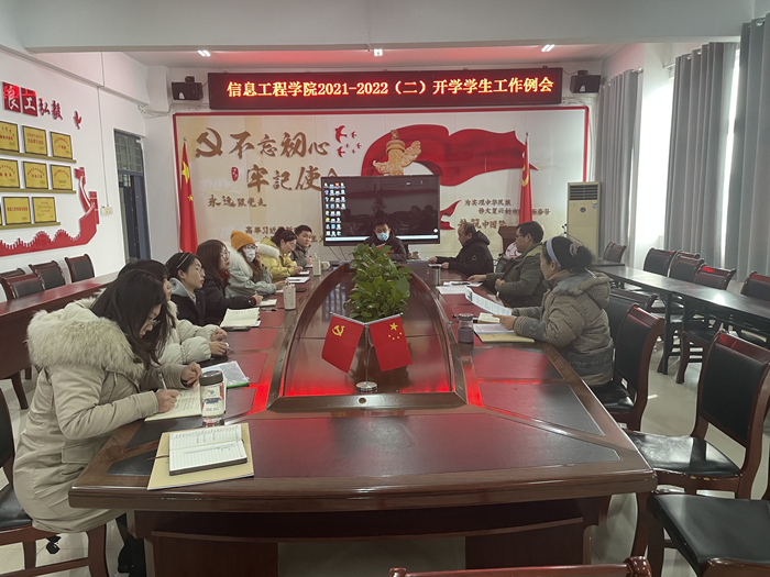 2022年2月19日上午,信息工程学院在工b315会议室召开2021-2022(二)春季开学学生工作会议。会议由信息工程学院党委副书记(临时负责)余晓永主持,信息工程学院党委副书记、纪委书记吴孝银、信息工程学院组织员(副处级)黄永刚和全体辅导员(班主任)参加了会议。