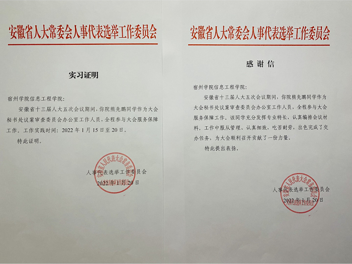 聚焦服务,积极投入。2022年1月17日-1月20日,安徽省第十三届人民代表大会第五次会议在合肥胜利召开,我院19软件工程(对口)班,熊先鹏同学作为大会秘书处议案审查委员会办公室工作人员,参与了本次大会的服务保障工作。会议期间,熊先鹏始终牢记自己身为宿州学院学生,以高度的责任感、饱满的工作热情、认真的工作态度、充分发挥专业特长、积极配合领导工作,为大会的顺利召开贡献了一份力量。