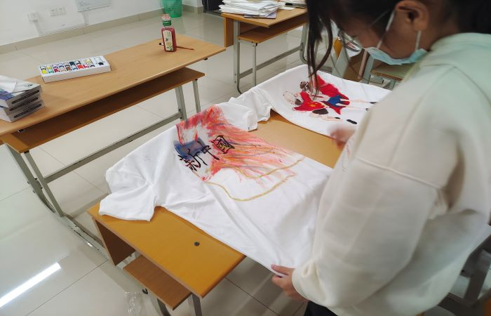 为激发广大青年的爱国热情,以创作实践表达对祖国母亲深沉的爱。信息工程学院于2022年10月19日下午3点至6点在实训楼A113举办了“迎国庆手绘T恤”设计活动。