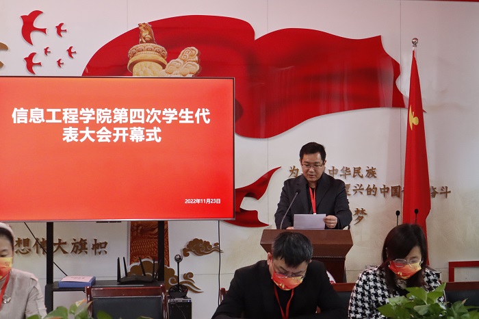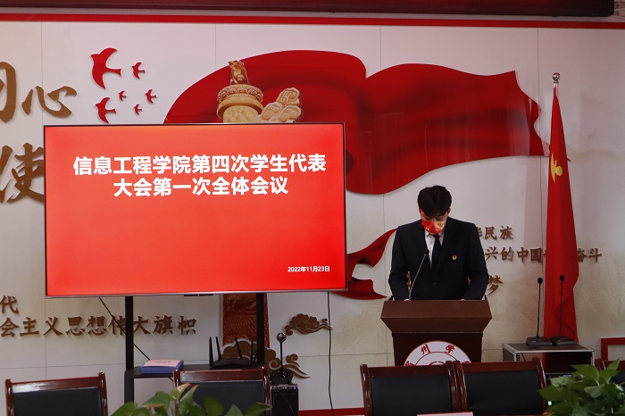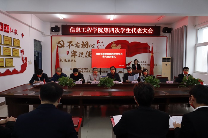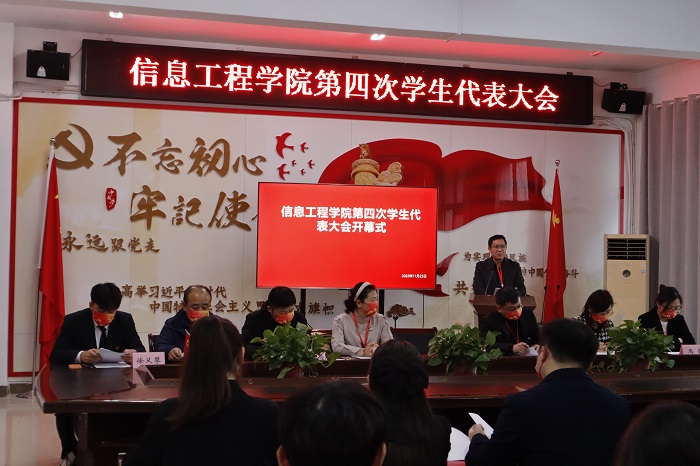 心有所信,砥砺奋进。11月23日,信息工程学院第四次学生代表大会在工科楼B315举行,来自各班级、各社团组织的50名学生代表齐聚一堂。院党委副书记余晓永(临时负责),党委副书记、院长许海峰,党委副书记、纪委书记吴孝银,副院长崔琳、副院长潘正高、副处级组织员黄永刚共同出席了此次大会,会议由周莹主持。