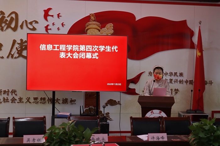 最后,学院党委副书记、纪委书记吴孝银致闭幕词。她高度赞扬了上一届学生会的工作成果,并鼓励学生会继续发挥凝聚青年、引领青年、服务青年的作用,全心全意为同学服务。她表示,此次大会是在全国学习、宣传、贯彻党的二十大精神的重要时间节点召开的一次大会,是我院党委贯彻党的二十大精神的生动实践。她鼓励学生代表们积极为学校的发展建言献策,希望全体信工学子心有所信、砥砺奋进,为实现中华民族伟大复兴贡献青春力量。