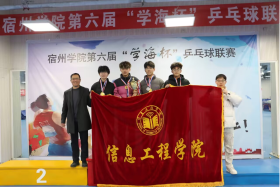12月12日,宿州学院第六届“学海杯”乒乓球联赛闭幕式在新体育馆举行,信息工程学院学子在激烈的角逐中,凭借出色的合作精神与过硬的实力,一路过关斩将,最终,取得了男团第一、男双第一和男单第二的佳绩。