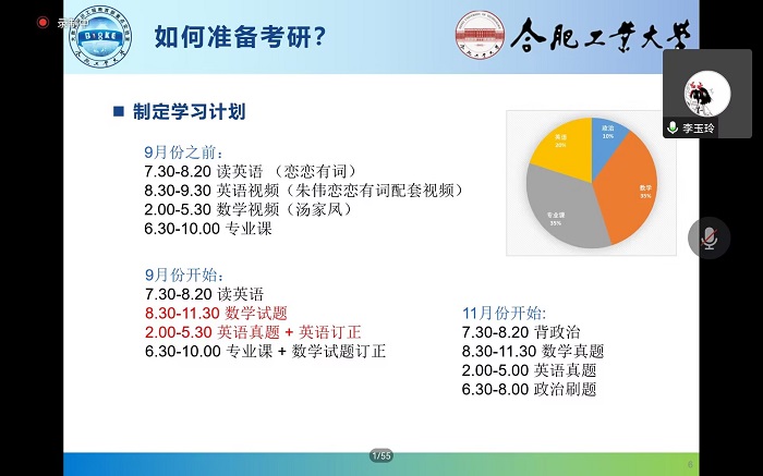 会议开始时,先发言的是毕业后选择考研的学姐。学姐先是肯定了考研的意义,分析了目前考研人数越来越多的现状,提醒同学们根据自己自身的情况来选择是否考研,不要盲目跟风考研。之后学姐向未来向选择考研的同学分享了自己的备考经验,教育同学们要目标明确,充分利用时间,在有限的时间内达到最好的学习效果。