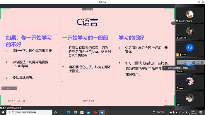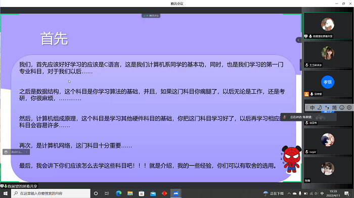 为激励在校学生明确学习目标,合理规划大学生活,解答同学们在学习和考研方面的困惑,信息工程学院21计算机6班于2021年4月11日晚在工科楼B212通过腾讯会议,组织优秀毕业生开展线上考研经验分享交流会。本次交流会会邀请到陈展望、徐圣伟两位学长,两人通过自己的努力考研成功上岸,将要就读于合肥工业大学,他们结合自身经历从学习方法、专业知识等方面讲述各自考研过程中的重要经历和宝贵的经验。