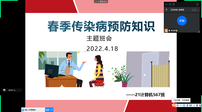 春季是多种传染病多发季节,为做好春季传染病防控工作,营造良好的生活环境,保障学生的身心健康,信息工程学院21计算机5、6、7班于4月18日晚在工科楼B212、B205、B207通过腾讯会议召开“春季常见传染病预防知识”主题班会。