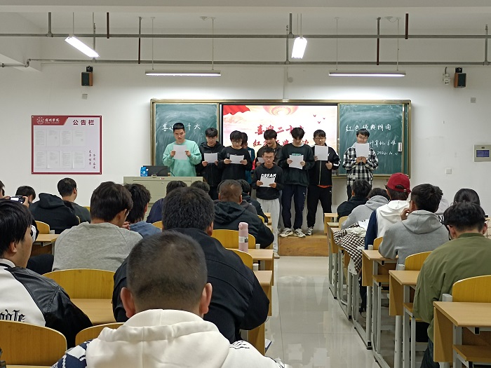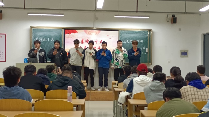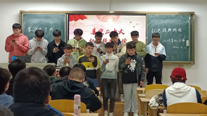 为迎接党的二十大胜利召开,热情讴歌党的百年奋斗历程和革命先辈的丰功伟绩,展现当代大学生朝气蓬勃、积极向上的良好精神风貌,2022年10月11日,信息工程学院21计算机6班于实训楼A209举办了以“喜迎二十大,红色经典诵读”为主题的红色经典诗文朗诵大赛。