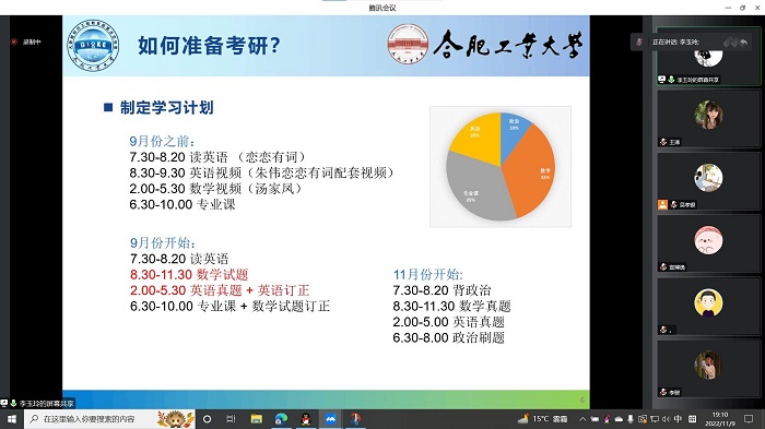 李玉玲学姐来自13软件工程(2)班,现在在合肥工业大学读博士,她向我们分享了她的备考经验,她谈到我们需要制定计划并且执行计划,并且需要劳逸结合,对于目标院校的选择也需要切合自身水平去报考,对于考研,她是这样说“我们需要明白自己将来想要做什么,自己是否真的想要考研,不要因为随大流而去考研,这类人往往也是最容易放弃的”,随后学姐又向我们分享了她的研究生生活,并且告诉我们现在不是躺平的时候,应该努力学习,提升自己。