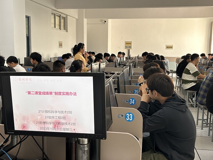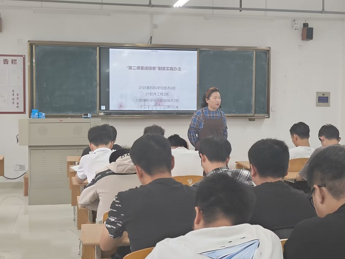 为了让同学们更加清晰地了解“第二课堂成绩单”制度实施的办法,以及如何获取学分,信息工程学院21计算机科学与技术2班、21软件工程2班、21数据科学与大数据技术2班分别于10月8日、10月9日、10月10日在工科楼B401开展了“第二课堂成绩单”制度实施办法主题班会,本次主题班会由辅导员吴孝银老师主持,全体学生参加会议。