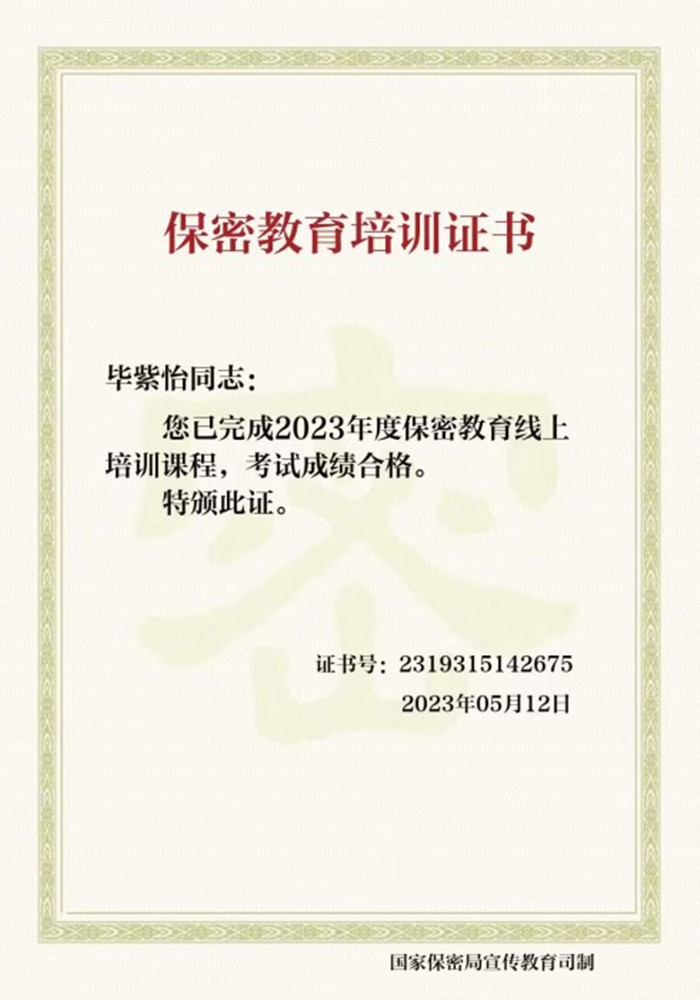 活动开始,班长策划整个活动并编写策划书,班长、团支书,宣传委员,组织委员在班级群进行宣传介绍国家保密局依托“保密观"APP和中国保密在线网站开设全国保密教育线上培训系统,参与人员登录培训系统学习指定课程,达到4学时后进行在线考试,成绩合格的线上颁发证书。参与人员注册时只填写手机号和昵称,形成证书时可以输入真实姓名,培训系统不记录该真实姓名。同学们自主进行学习,并将学习证书交由团支书汇总。