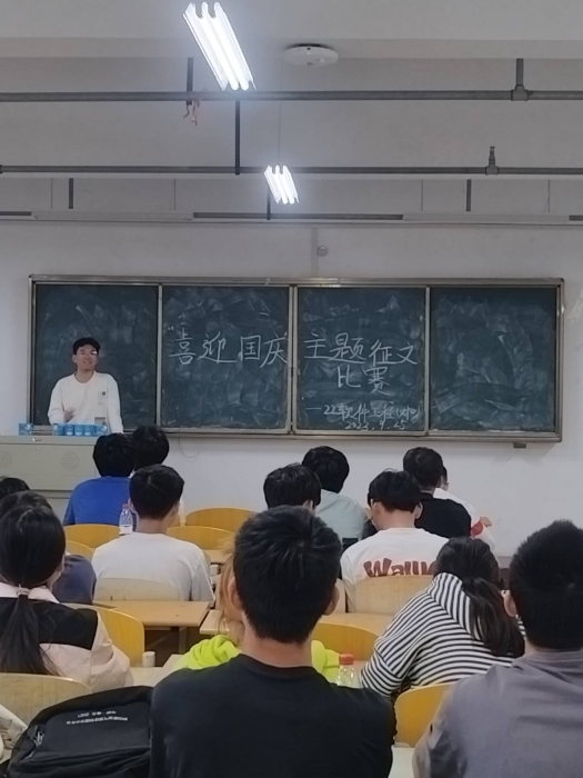 在中华人民共和国即将迎来74周年华诞之际,为了热烈庆祝这一重大节日,同时展示广大学生对于祖国的深深热爱和美好祝愿,信息工程学院22软件工程(对口)班以“喜迎国庆”为主题,于2023年9月25日实训楼A楼206教室举办征文比赛。出席此次活动的有22软件工程(对口)班全体学生。
