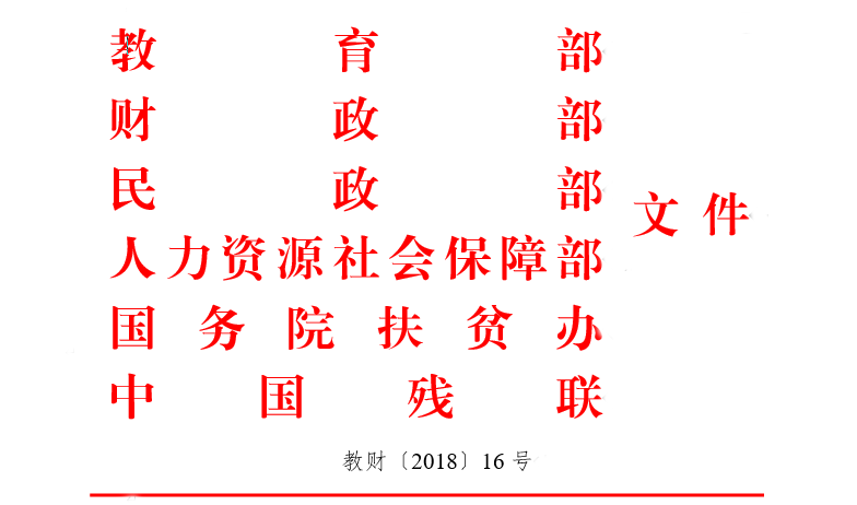 各省、自治区、直辖市教育厅(教委)、财政厅(局)、民政厅(局)、人力资源社会保障厅(局)、扶贫办(局)、残联,各计划单列市教育局、财政局、民政局、人力资源社会保障局、扶贫办(局)、残联,新疆生产建设兵团教育局、财政局、民政局、人力资源社会保障局、扶贫办、残联,中央部门所属各高等学校: