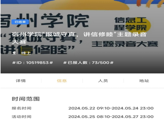 为了让学生们进一步了解国家资助政策,强化同学们的诚实守信意识,增强我院诚信育人的良好风尚。信息工程学院学生管理助理总队于2024年5月22日至2024年5月27日在线上举办了信息工程学院“报诚守真,讲信修睦”主题录音大赛。参与本次活动的是宿州学院全体在校大学生。