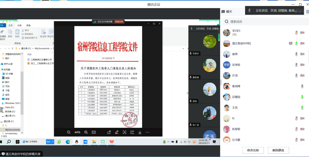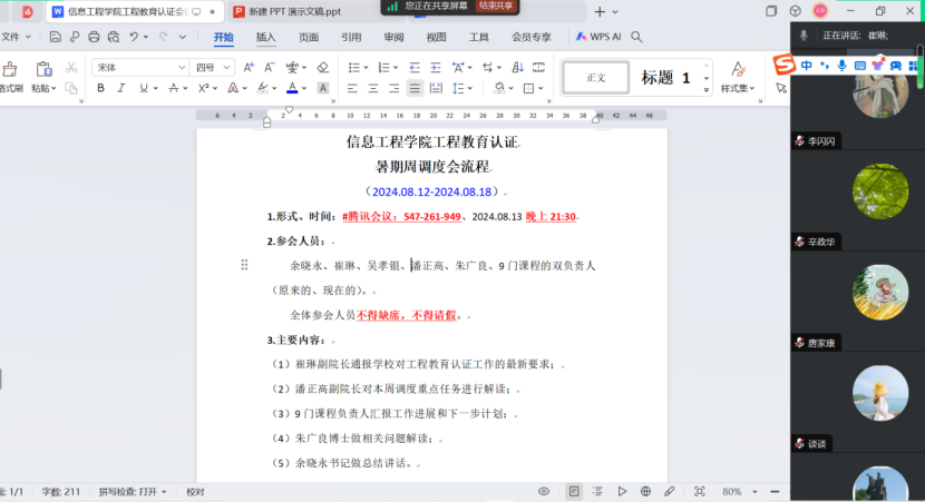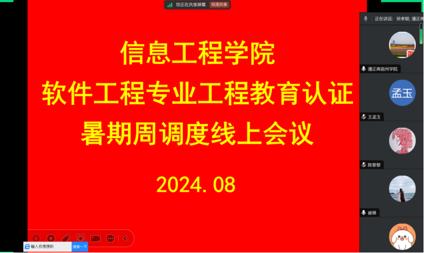 2024年8月13日晚,信息工程学院通过腾讯会议召开了工程教育认证暑期周调度会。本次会议旨在贯彻落实学校对工程教育认证工作的最新要求,确保各项任务按时推进。党委书记余晓永,党委副书记、副院长(临时负责)崔琳、党委副书记吴孝银、朱广良博士以及9门核心课程负责人参加了会议,会议由教学副院长潘正高主持。