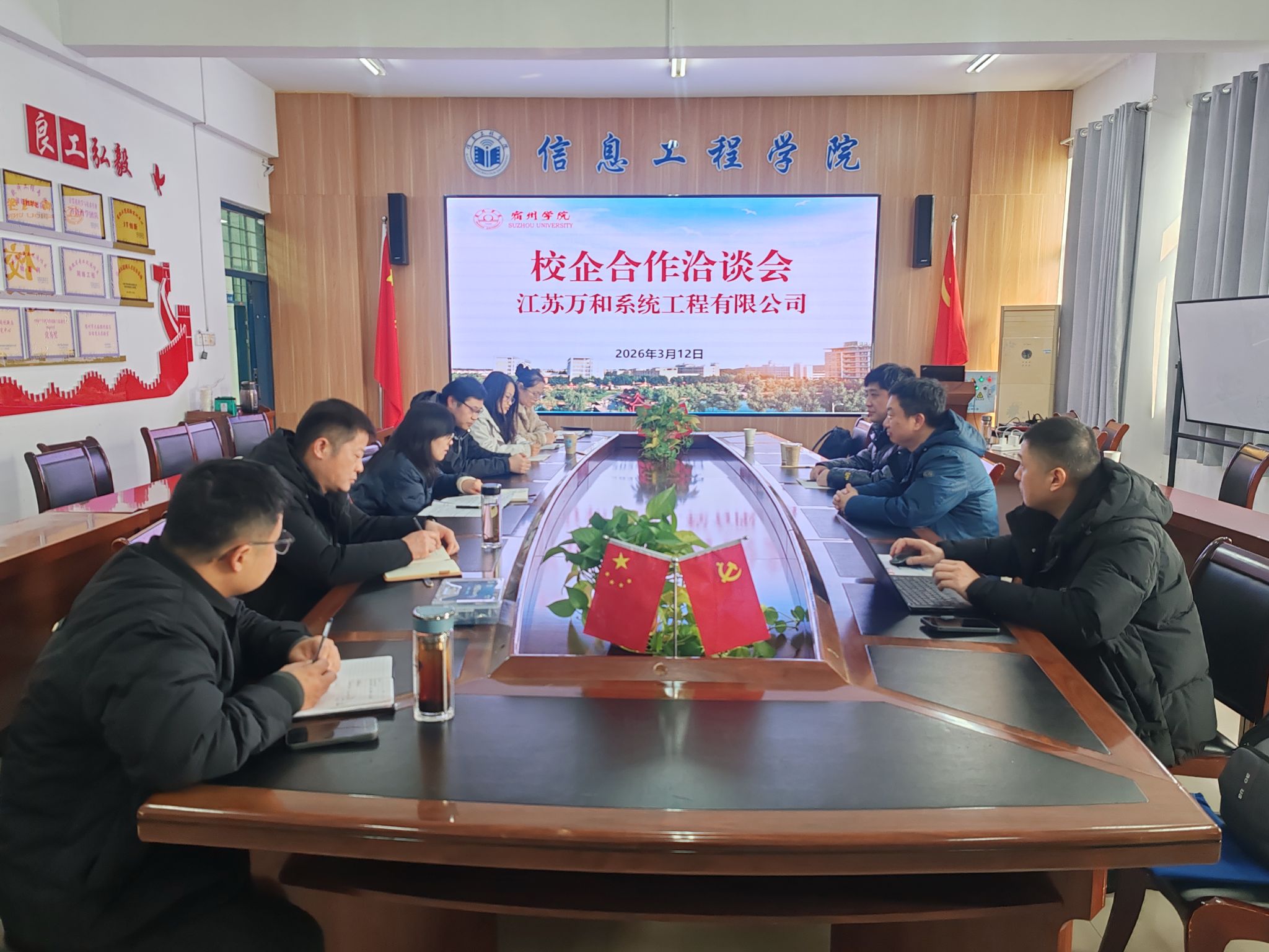 2026年3月12日,信息工程学院与江苏万和系统工程有限公司召开校企合作洽谈会,信息工程学院党委副书记、院长崔琳,副院长潘正高、实习实训中心主任浮盼盼、办公室主任田文泉,教研秘书高亚兰,教研室主任徐旭、秦闻博,江苏万和系统工程有限公司苏正坤、朱庆、韩天参加会议。会议由崔琳主持。
