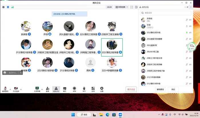 为促进教学质量监控和信息反馈,12月14日下午两点半,信息工程学院利用腾讯会议召开了期末教学信息员会议.会议由信息工程学院教学秘书徐旭老师主持,院教学副院长潘正高,院教学督导组组长吴孝银及督导组成员姜飞、张志伟、陈黎黎,校级信息员、各班级教学信息员参加了本次会议。