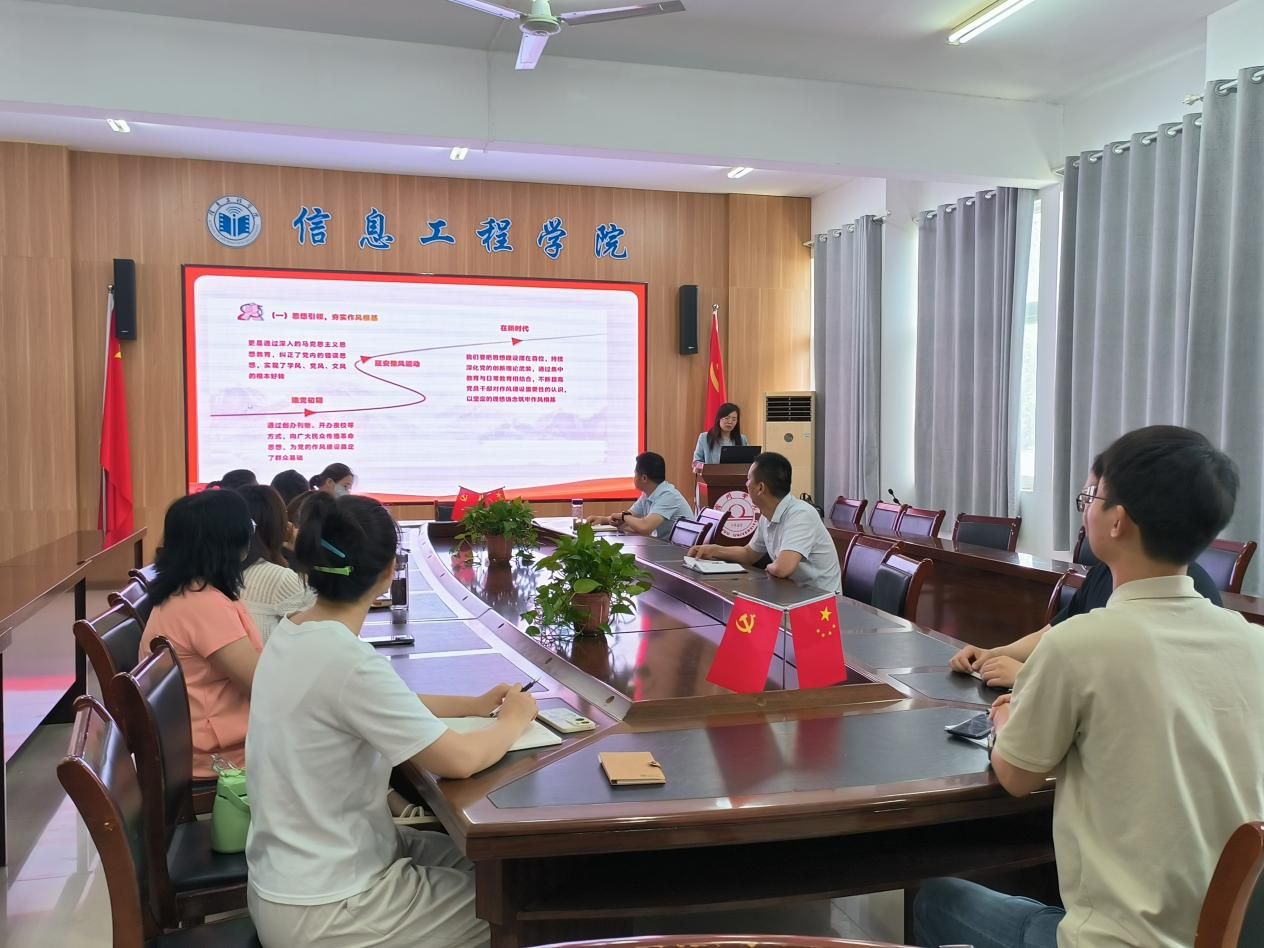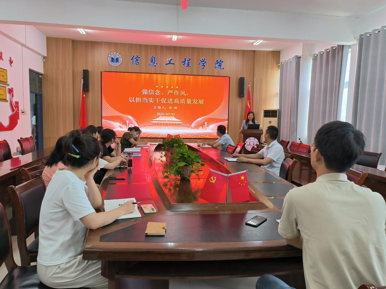 2025年7月1日上午,信息工程学院党委副书记、院长崔琳在工B315会议室为软件工程教研室教师党支部全体党员讲授题为“强信念、严作风,以担当实干促进高质量发展”的专题党课。本次党课结合党史学习教育、现实剖析和未来展望,深入探讨作风建设在推动学院高质量发展中的重要作用,激励全体党员教师坚定信念、严明作风,勇担育人使命。